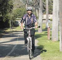 When I show up at work on my bike in the rain people are often surprised. I ask them how they think I got to school when I was growing up back East? The difference is that now that I am an adult I can afford a rain suit, so I can stay dry. And it just doesn’t rain much here. The fact is that we live in one of the best places on earth for bicycling. Where else do you have the limited rainfall of a desert with the moderate temperature of a seashore? Most of us live, work and shop in the coastal plain which is relatively flat. If you are looking for a workout, there are plenty of challenging mountain climbs, but if you just want to get around, you have a pretty easy ride. For decades I have done battle with our elected officials and staff to get better cycling facilities. Yet, we already have one of the most complete bike lane and path systems you could ask for. Some people complain that there are sections of the route from home to work that are not perfect for biking. Yet about one third of the people in Goleta live within a 15-minute bike ride of their jobs and most live even closer to their shopping needs. For these complainers, I would ask them seriously to consider what they would do if there were a special bike path that ran directly from their home to their work just for them. I am amused by the people who spend good money to drive distances they could easily walk or bicycle. And then they spend good money to join a gym so that they can get the exercise back that they gave up by driving. One concern that we hear a lot is the danger of being hit by a car when you ride a bicycle. As many of you know, a car hit me back in February. It was near what is arguably the worst designed area for pedestrians and cyclists in our fair city, the Big Box Mall. After a month in the hospital and lots of therapy and healing yet to do, some say that I am crazy to go back to bicycling. The fact is that as dangerous as cars make our city, it is still safer to ride a bike than to drive. Although cars kill tens of thousands of Americans each year, the biggest killer is heart disease, which kills hundreds of thousands each year. Inactivity kills more people by far than any activity ever does. Every minute you are walking or biking instead of driving you are actually extending your life expectancy. One answer I give people who are surprised I am biking again: The bike didn’t hurt me, the car did. If you would ride a bicycle, too, then you wouldn’t be a threat to me and other pedestrians and cyclists. Which brings me to my greatest joy of bicycling: public service. Every time you ride a bike instead of drive you are helping your community and the planet and that feels great. To me, driving in a city is like wearing muddy boots in someone’s living room. Biking or walking is just more polite and considerate. No noise, no threats to life and limb of your neighbors and no pollution or greenhouse gases. While I love the American way of life when that means democracy and citizen participation, our American way of consumption is quite embarrassing. People suffer and die around the world every day as a result of that consumption. It is not sustainable politically, economically or ecologically. In Europe, where I lived as a young child, you see people of all ages and abilities using bicycles as daily transportation. Men in suits carrying briefcases, women in long dresses on their way to work and children on their way to school. Elderly people go a bit slower, but they are just as likely to be on a bike as someone half their age. You don’t have to be in a rush. The bicycle will get you to most of your Goleta destinations in 15 minutes even at a modest 10 mph. My ride from home to work is so short that I usually take an extra ride on the way in to take in our local beauty. I cruise by Goleta Beach and look out to sea. Once I saw a fox and I always see magnificent birds. Or I go by Lake Los Carneros, pedaling very slowly along the paved path to take in the beauty of the lake and the mountain backdrop. Often I see rabbits watching or hopping alongside me. Or I cruise along Cathedral Oaks Road taking in the views of the orchards at a refreshing pace. While viewing the mountains and the ocean I can view the agriculture that is part of the past, present and future of our town. If you have never tried biking in our wonderful community, I ask you to try it just once. Go to any bike shop and get a free map showing all the best routes. If you don’t own a bike, many shops will rent or lend you a bike to try out. Goleta is a place just made for bicycling. The gentle weather, the modest distance scale, the terrain and our semi-casual lifestyle are all tailor-made for making the bicycle your primary mode of transport. Give it a try just once. Not only will your neighbors and the planet be grateful. You just might find the daily joy that I have found in experiencing Goleta by bicycle. Robert Bernstein lives in Goleta and is senior design engineer for Digital Instruments. Photo Caption: Robert Bernstein, shown here on the bike path near Goleta Beach, is an avid bike enthusiast and advocate for alternative transportation. |